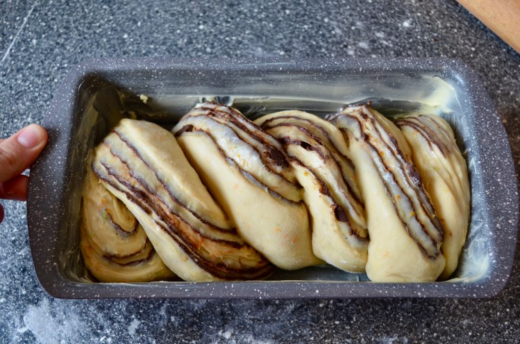 Preheat oven to 180C and bake chocolate babka bread for about 30 minutes.